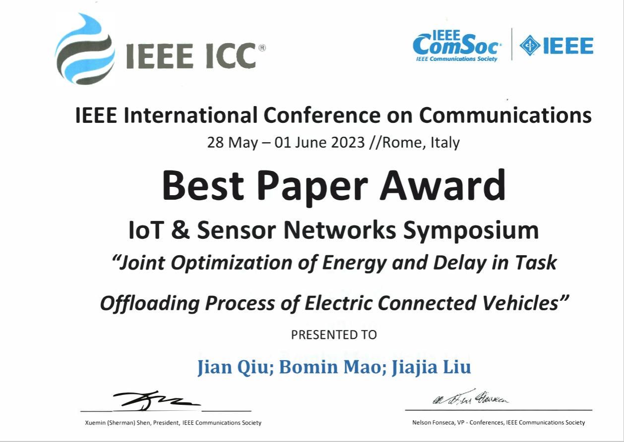 刘家佳教授团队的研究成果“Joint Optimization of Energy and Delay in Task Offloading Process of Electric Connected Vehicles”在众多论文中脱颖而出,获得了本次大会最佳论文奖。该论文伦理片