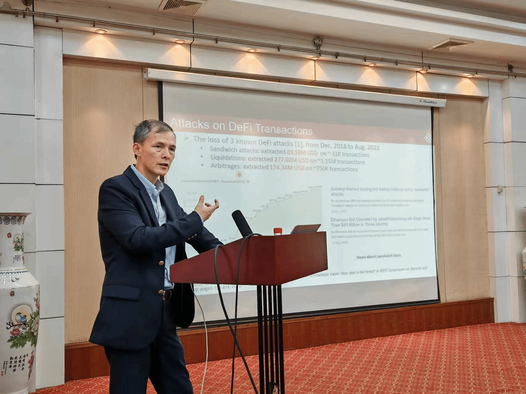 在这次报告会上,肖斌教授深入浅出地介绍了区块链技术在数字资产保护方面的重要性以及其在DeFi(去中心化金融)和NFT(非同质化代币)领域的应用。首先他介绍了数字资产保护,包括DeFi中的加密货币和NFT中的数据文件。接下来肖教授提出了对DeFi AMM协议的新颖攻击即n-MVTL攻击,并介绍了流动性池和掉期费用等。基于交易选择原则,肖教授提出了最优算法和最优攻击策略,并验证了攻击的有效性。最后介绍了与数据交换相关的隐私问题,以及我们利用NFT实现数据可追溯性、隐私和交换公平性的方法。
