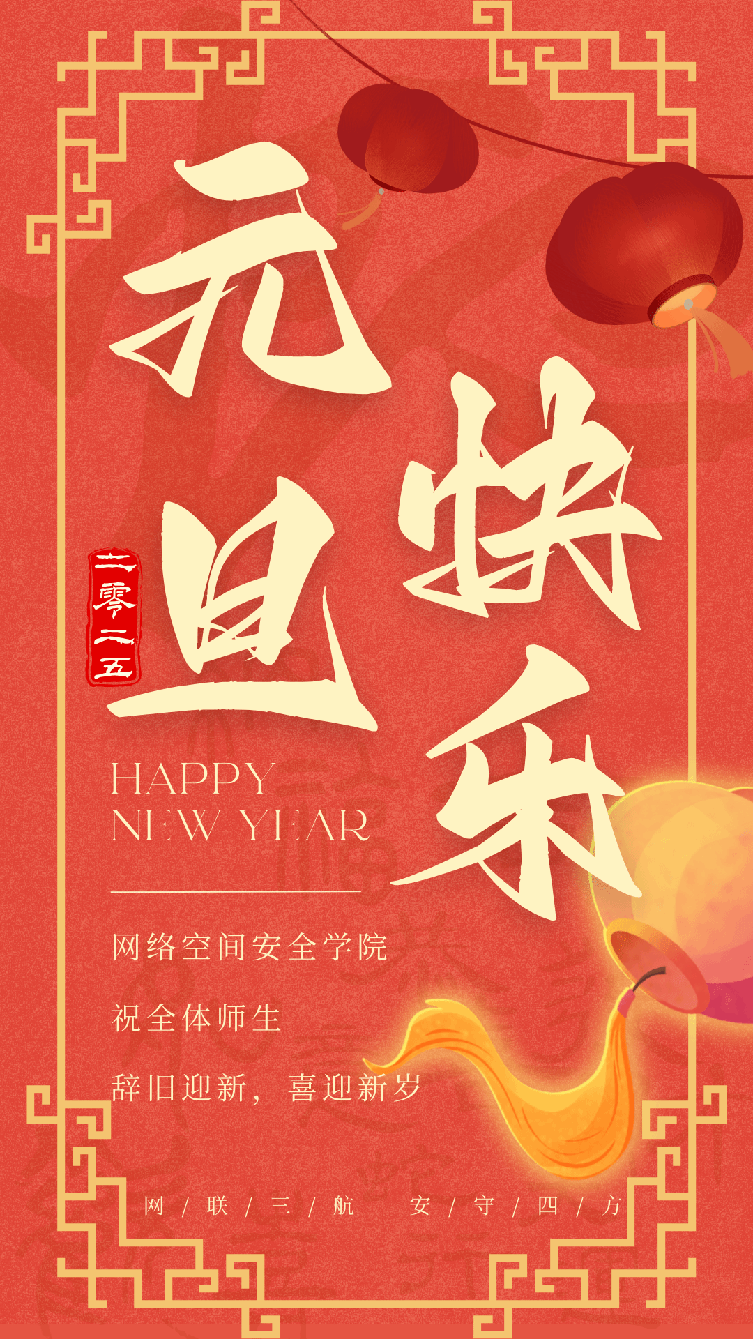 /国家保密学院全体师生员工向您致以最诚挚的新年祝福,并衷心感谢您一年来对学院发展的关心与支持。2024年,在习近平新时代中国特色社会主义思想的指导下,在中央网信办等上级单位和学校党委的坚强领导下,我们共同见证了学院跨越式发展,在这一年的风雨历程中,我们的心跳与学院的发展同频共振,每一份荣耀都凝聚着我们的智慧与汗水,每一步前进都铭刻着我们的奋斗与坚持。