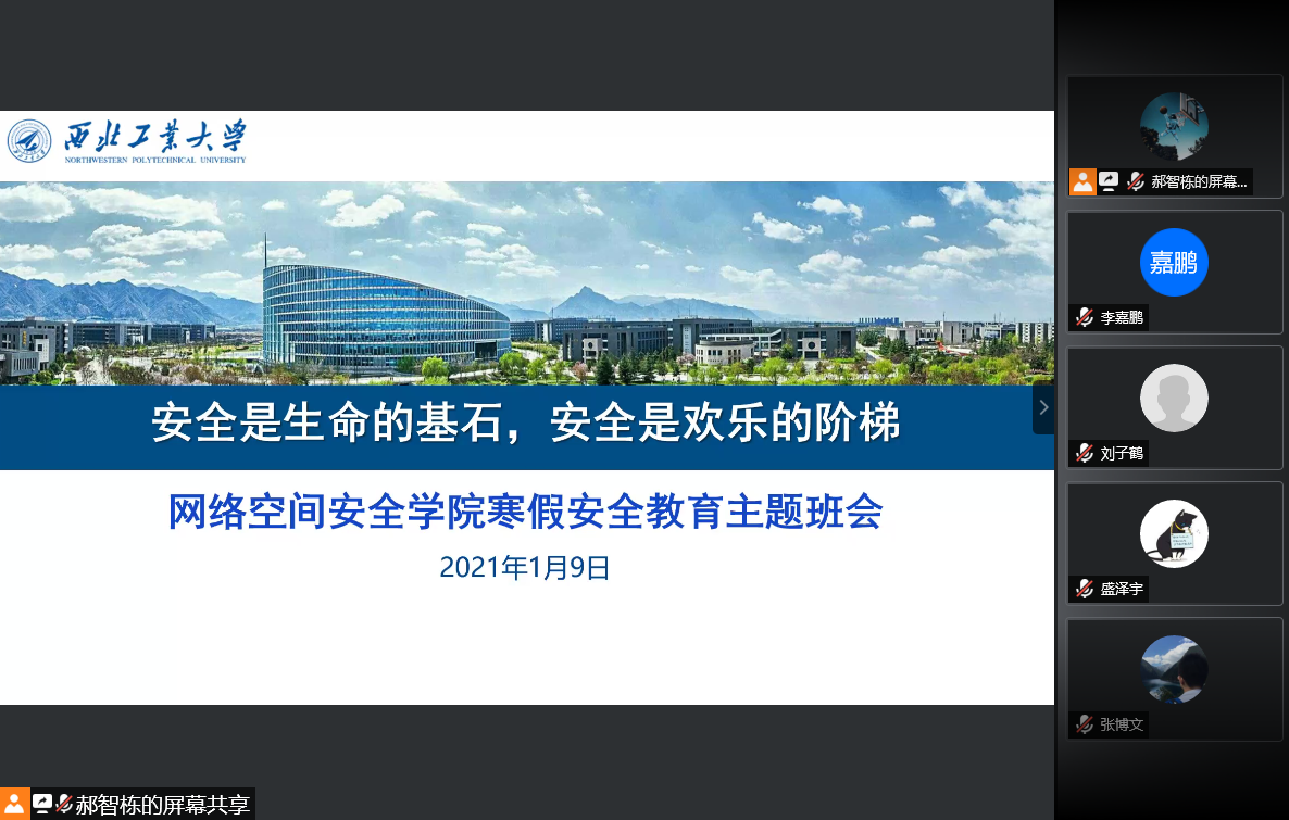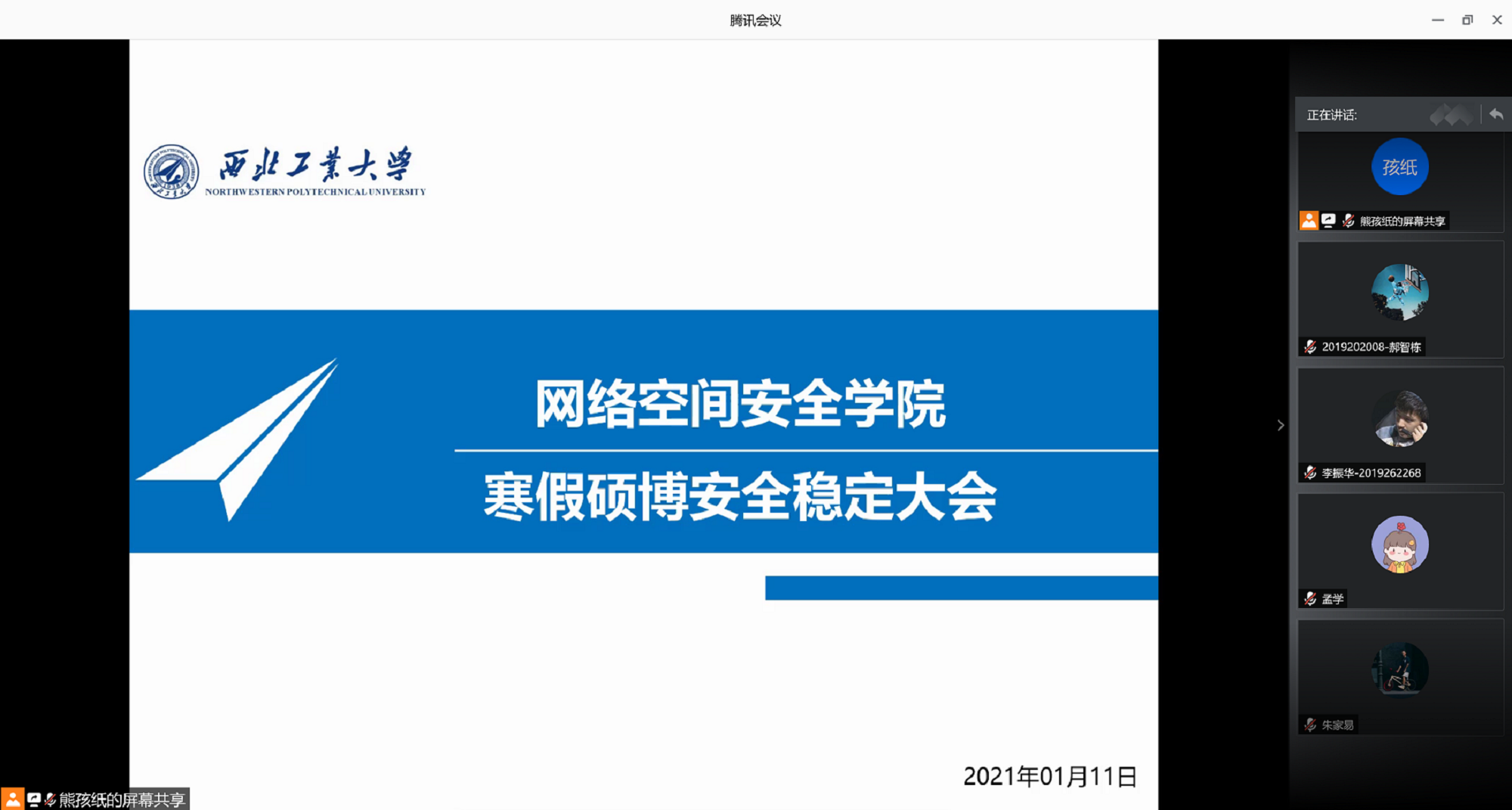 1月9日和1月11日,学院在线上分别组织召开本科生和研究生寒假安全教育大会。会上,学院辅导员王昌昌带领同学们认真学习了学校《关于进一步做好2021年寒假学生离校返校有关工作的通知》,就寒假离校返校有关规定和要求进行了详细讲解。同时,他从疫情防控、个人生命财产安全、心理健康等方面对学生进行了安全教育。“生命重于泰山,安全高于一切”,王昌昌代表学院预祝各年级同学度过一个平安快乐的假期。