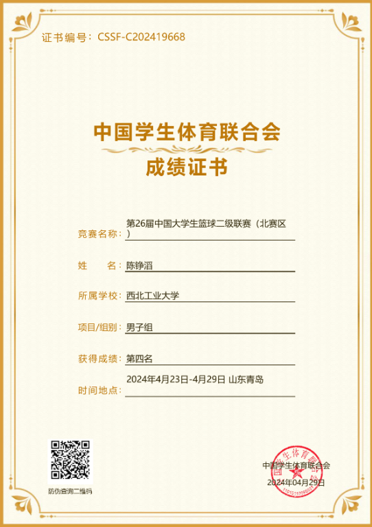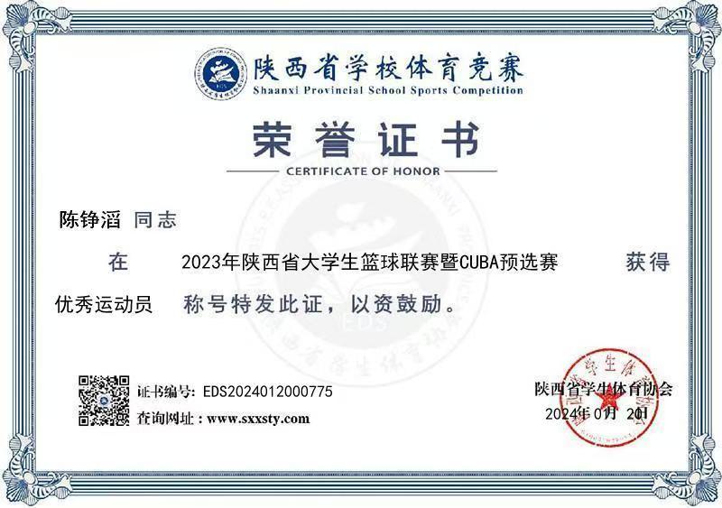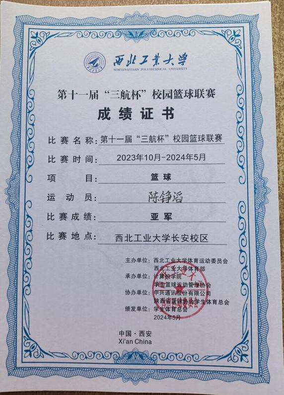 普通生男篮队长,曾代表学校征战第二十四、二十六届中国大学生篮球二级联赛全国总决赛和北区赛,连续取得优异成绩(全国总决赛第四名、北区赛第四名、总决赛第六名)。在陕西省级赛事中,他所在队伍三获亚军、一获季军,个人被评为“2023年省联赛优秀运动员”。此外,在校内“颜怡梯杯”“季忆留夏”等赛事中也多次夺冠,成为队友信赖、赛场尊重的核心力量。