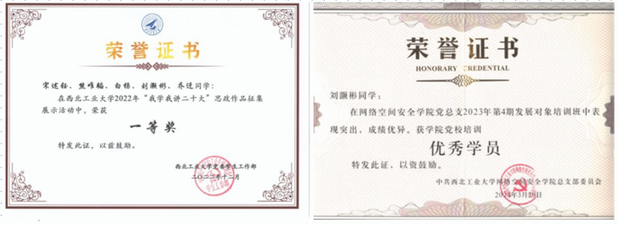 理想信念坚定,积极向党组织靠拢。自大一入学提交入党申请书以来,不断接受党的教育,于2024年成为了一名光荣的共产党员。积极参与思政教育活动与社会实践,参与如五四青年说、我学我讲二十大等思政活动,并前往革命圣地延安参观学习。在第十五期“青年马克思主义者培养工程”大学生骨干培训班中评为“优秀学员”。在2022、2023、2024年五四表彰中连续三年被评为“优秀共青团员”。