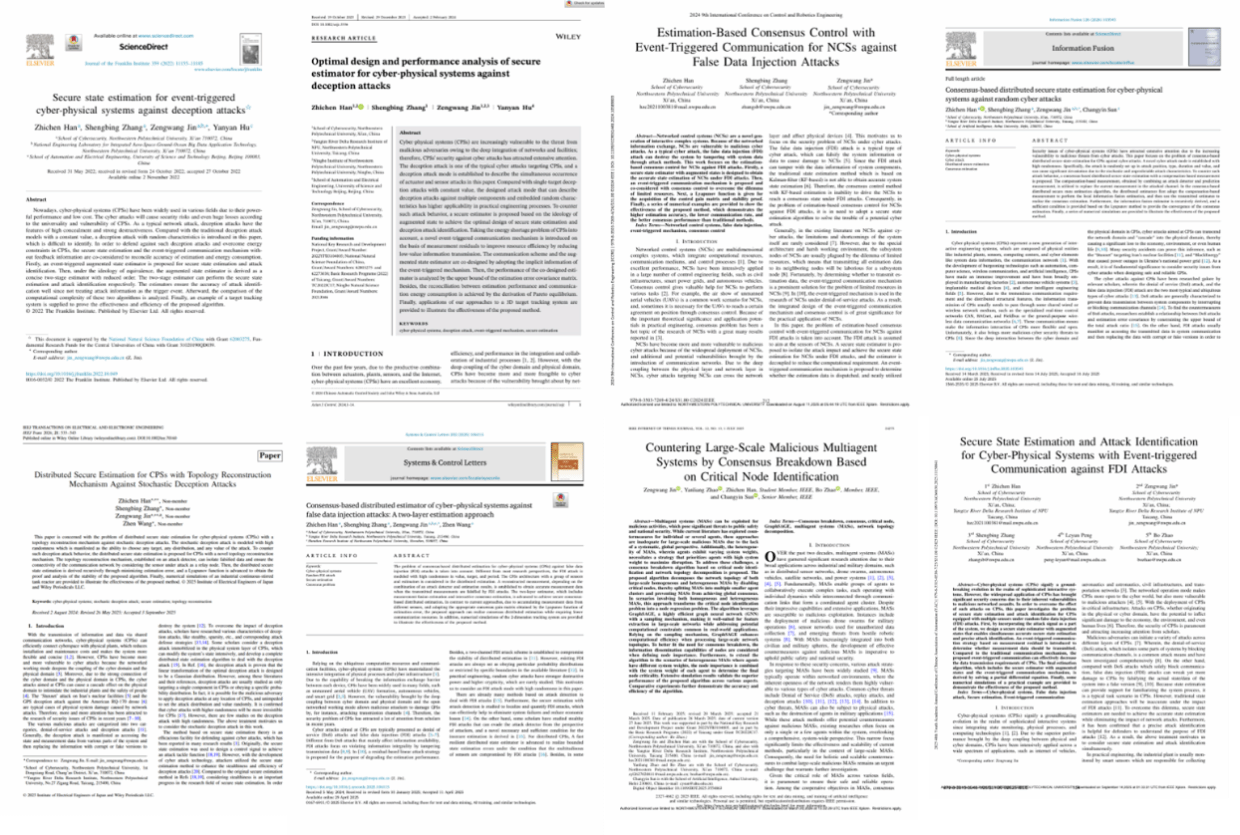 [1] Han Z, Zhang S, Jin Z, et al. Consensus-based Distributed Secure State Estimation for Cyber- Physical Systems against Random Cyber Attacks[J]. Information Fusion, 2026, Volume 126, Part A:103545.(中科院 SCI 一区)