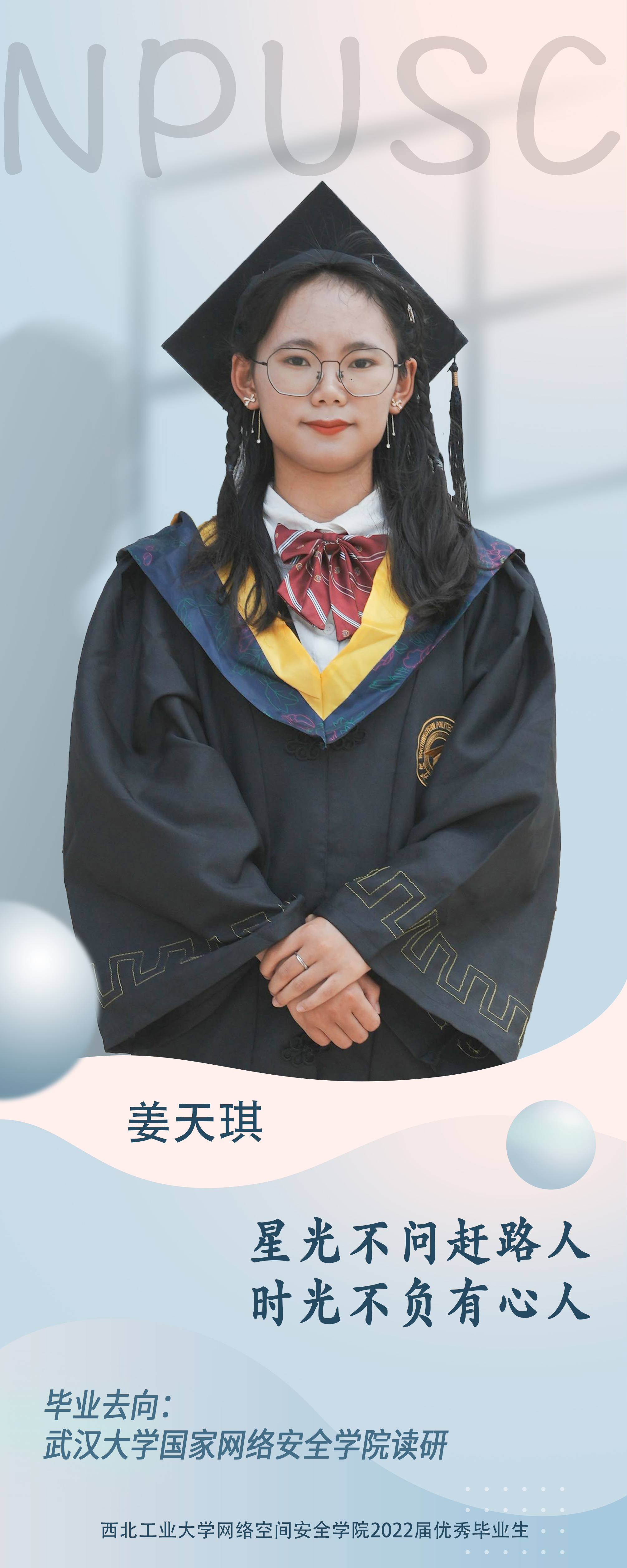 学院2018级本科生姜天琪。学习上,她态度端正勤奋好学,目标明确学习热情高。在努力做到学好专业知识的同时,还涉猎其他方面的知识,最终也取得了优异的成绩,连续三年获得院优秀奖学金。学习之余,她还爱看各种文学类书籍,想要由此提高自己的思想境界。生活上,她一直保持着“走一步,停下来,思考一番,再继续走,稳扎稳打”的生活态度。乐观向上,踏实务实是大多数人对她的评价。本科期间曾担任学生会副部长。曾获得院优秀学生、伦理片