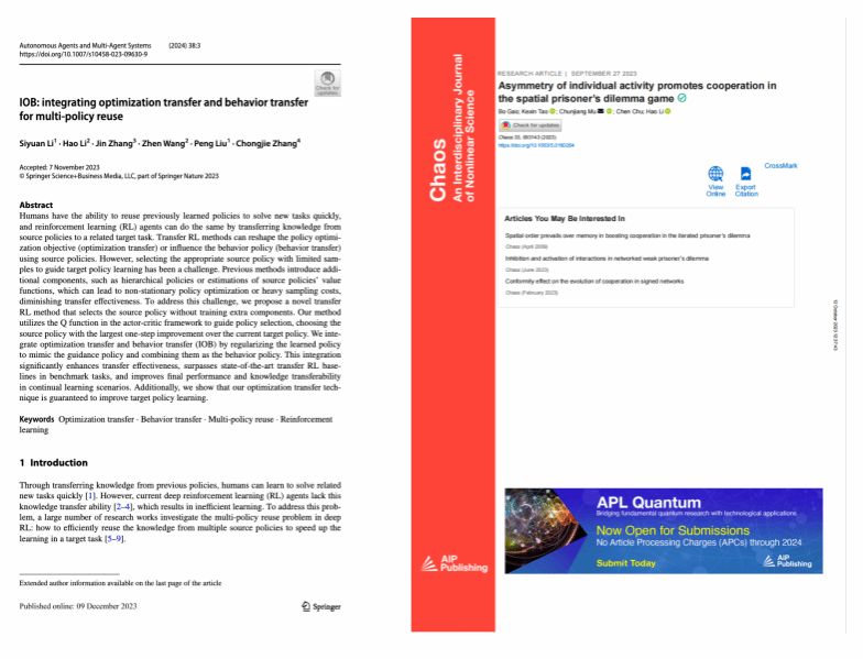 《IOB: integrating optimization transfer and behavior transfer for multi-policy reuse》学生一作,发表于JAAMAS
