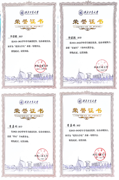 李嘉鹏自入学起便认真对待每一门课程,重视基础知识学习,课下细心整理笔记,学业成绩一直位于年级前列,并获得校级一等奖学金、华萌奖学金、吴亚军三等奖学金。李嘉鹏在计算机网络、网络安全等课程的学习中被网安学科的魅力所深深吸引,将师从刘家佳教授进一步深造探索。