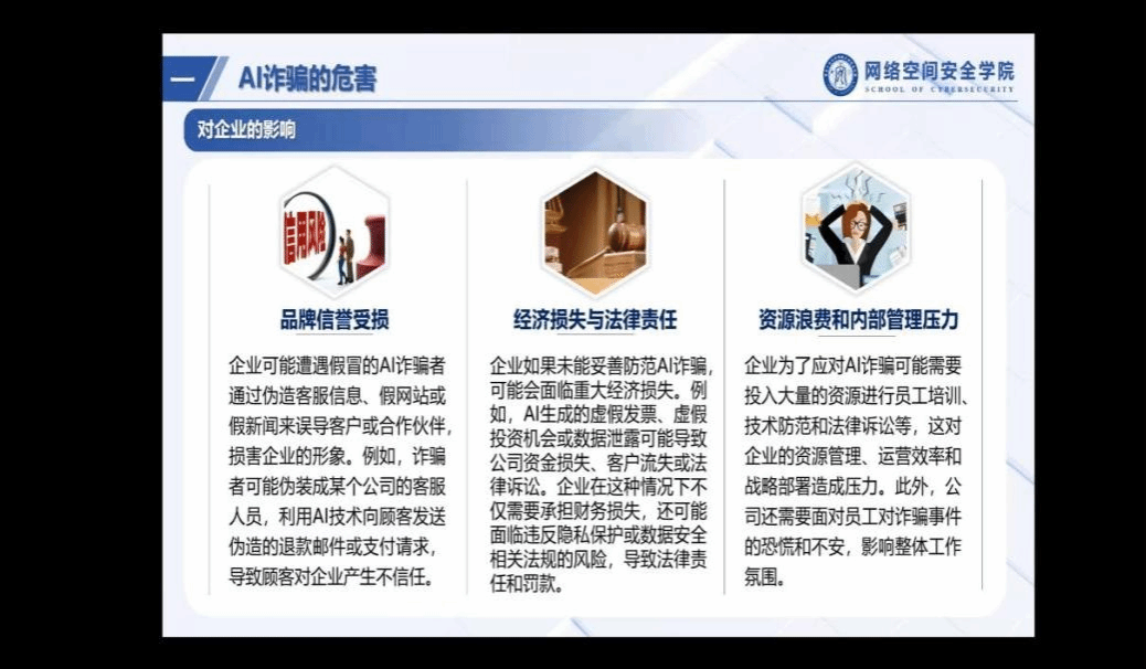 在数字化浪潮迅猛推进的当下,AI技术如影随形,在带来便利的同时,也悄然滋生出新的安全隐忧。2月6日,马君儒同学精心呈现了第二期精彩课程,聚焦AI诈骗这一前沿话题。课程阐述了AI 诈骗的定义、背景与危害,让同学们对这一新兴诈骗形式有初步了解,同时详细介绍了 AI 诈骗的常见类型,涵盖深度伪造、钓鱼攻击等多个方面。为了提升同学们的识别能力,课程不仅传授了实用的AI诈骗识别技巧——如视频与音频内容的真伪辨识、网络信息的甄别等,还通过真实案例的深入分析,将理论知识与实际场景紧密结合。