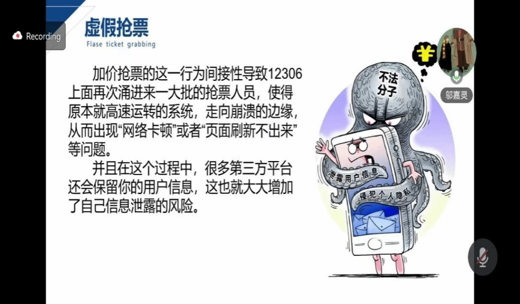 假期期间,旅游需求提升、出行人数增多,而与出行有关的诈骗风险也在上升。2月9日下午,邬嘉灵同学带来了精心准备的第五期课程。课程以“飞机票改签诈骗”为切入点引出主题,从购票时、购票后、候车时、路程中四个阶段,结合具体案例,介绍诈骗分子是如何逐步诱导旅客上当受骗,并针对不同的诈骗手段给出反诈骗建议,提醒同学们务必认准官方渠道,提高警惕,防范陌生人,守护自己与他人。