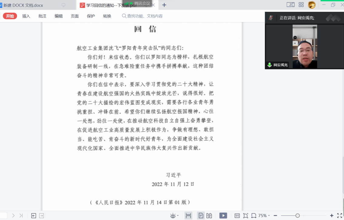 报告结束后,禹亮副书记带领党员师生学习了习近平总书记给中国航空工业集团沈飞“罗阳青年突击队”的队员们回信精神,指出航空报国精神是中国共产党精神谱系的重要组成部分,希望全院师生把航空报国精神与网络强国战略思想相融,在建设一流示范网安学院、推进网安学院的各项工作中做出贡献。学生代表吕佳文同学分享学习的心得体会,他表示沈飞“罗阳青年突击队”的队员们的进取精神值得所有为实现中华民族伟大复兴而努力的中华儿女学习,作为一名新时代西工大青年、一名网安学子,将始终牢记习近平总书记的殷切嘱托,努力提升思想水平,学习专业知识技能,为维护国家网络空间安全,实现国家富强、民族复兴贡献力量,让青春在奋斗中绽放绚丽之花。