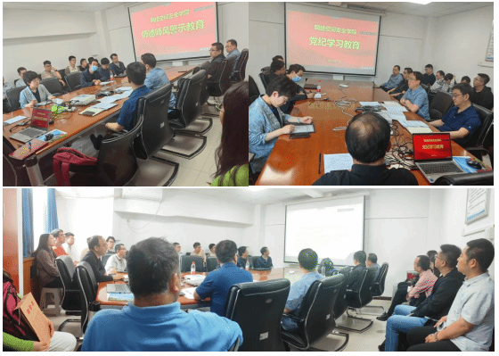 4月26日、5月7日,学院分别以线上、线下的形式召开全院教职工大会,会上通报了上级关于党纪学习教育的要求和学院部署安排,强调要进一步加强师德师风建设和学院安全保密工作,严守教学纪律底线,并开展了警示教育。会议要求全体教师要强化师德修养,培养良好的导学关系,恪守学术诚信,坚持底线思维,为学校和学院高质量发展提供坚强的党纪和师德保障。